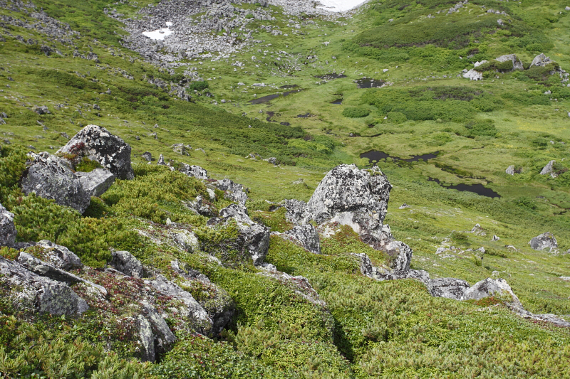 しばらく岩の上を飛ぶように登ったとき、一気に視界が開け、眼下にはトムラウシ山頂から続く南斜面の全貌と点在する池沼と奇岩が姿を現した!