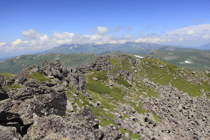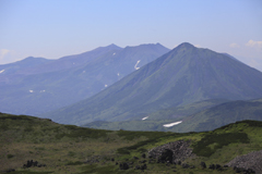 一旦トムラウシ公園に下るとその後はさらに登りが続く。南沼キャンプ指定地を左に望みながら左後方を見ると十勝岳連峰がくっきりとその全貌を見せていた。中央の小さくとがった山が主峰十勝岳、右手前の秀峰はオプタテシケだ。ご存知の通り、トムラウシ山から十勝岳までは稜線を通って縦走することができるがその道のりは容易ではない。前方を歩いていた男性は「こうやって見ると近くに見えるんだけどなぁ・・・」と感慨深げに目を細めていた。