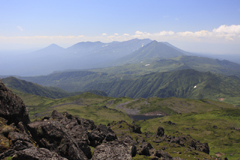 山頂には十数人の登山客が休んでいた。山頂はまだ風が強かった。山頂から十勝岳連峰を望む。