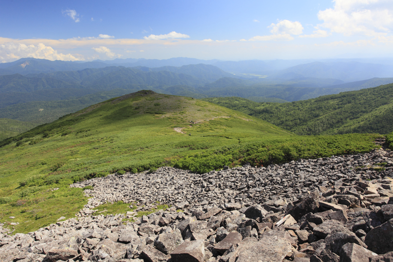下山途中で左前方を見ると、トムラウシ公園のはるか彼方に、幌尻岳を筆頭にそびえる日高山脈の山々が見えた。