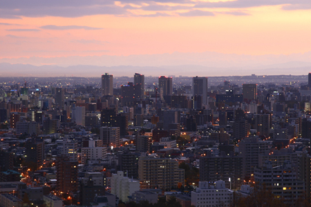 旭山記念公園から見た札幌の夜明け。この日は札幌ドームの辺りから太陽が昇ってきた。