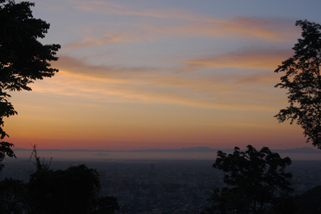 夏の日の夜明け前、藻岩山中腹から見た札幌の朝焼け。