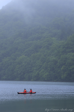 支笏湖の湖面を滑るカヌー。