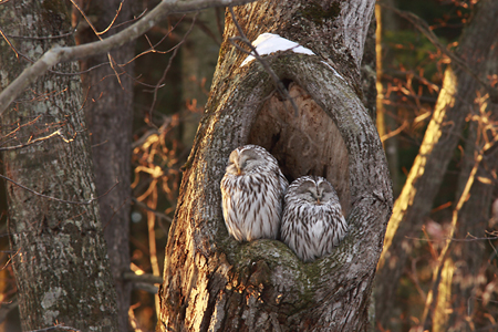 森の中で寄り添っている二羽のエゾフクロウ。