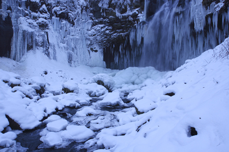 真冬のアシリベツの滝。モノトーンの空間に形作られた氷瀑がすごい迫力であった。