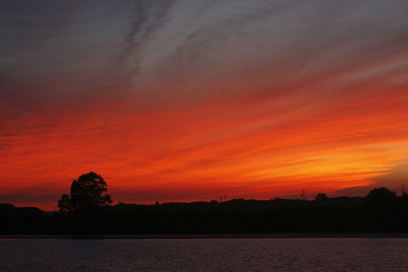 茨戸川の夕焼け。対岸の木をズームして撮影してみた。まるで本当に空が燃えているようだ。