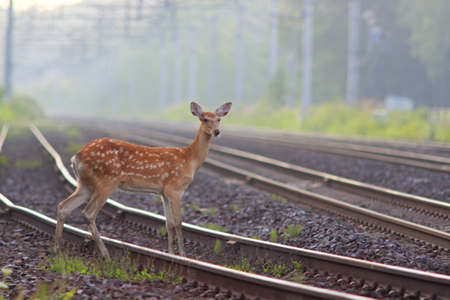 よく晴れた日が続いていて、特に早朝は気持ちがよい。ある朝、西の里信号場でカメラを構えて構図を決めているとファインダー内にエゾシカが飛び込んできた。まだ子供なのだろうか、メスのようだがやや小柄な感じだ。