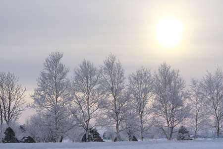一歩外に出るとまだまだ冬景色。 気温が下がった日、札幌郊外で木々が銀色に輝いた。