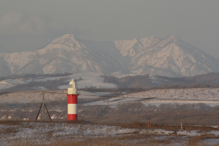 石狩灯台を望遠レンズで圧縮効果を狙った。後ろにそびえる山は神居尻山だ。