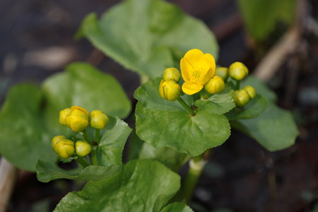 つぼみ状態のヤチブキから一つだけ花が開花していた。