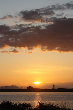 石狩灯台に夕日が沈む。