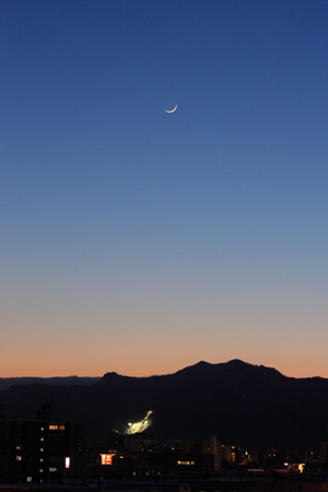 薄暮の大倉山シャンツェと月齢1.8の月。