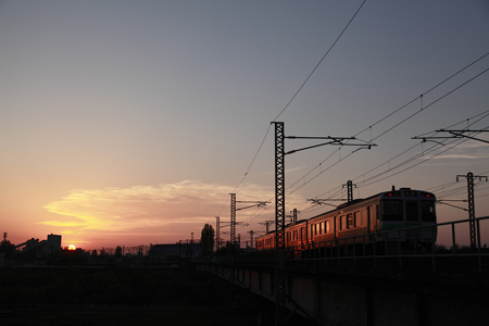 夕日を浴びて札幌市内に向けて走り去ってゆく、721系普通列車...