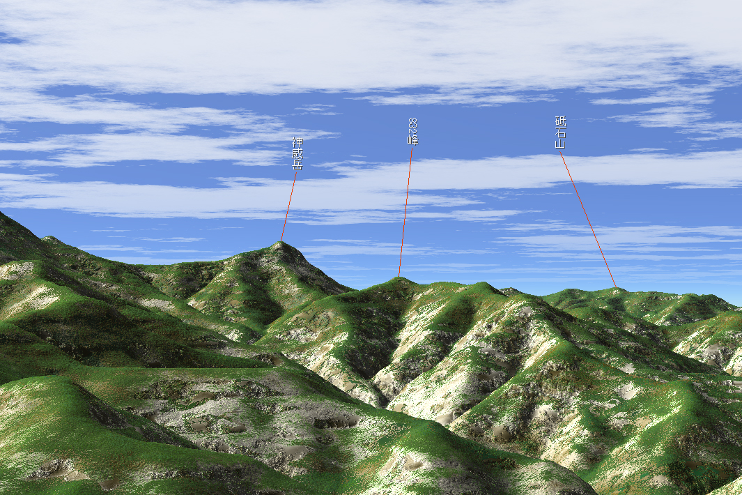 カシミール3Dで背後の山を同定するとこんな感じ。左側のなだらかな傾斜は烏帽子岳です。