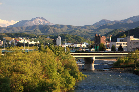 新緑の豊平川の向こうにはるか恵庭岳を望む。