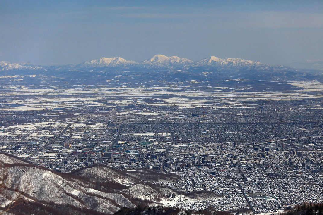 百松沢山より樺戸山塊方面。一番近い市街地は西野。札幌新道のラインが見える。