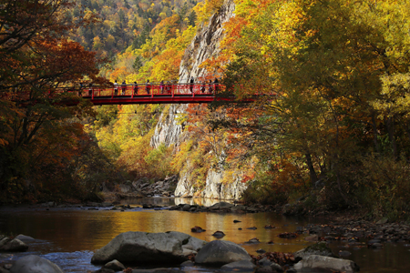 豊平川の源流にかかる吊り橋と紅葉。 今日は定山渓の二座に登ってきた。下山途中、かじかむ手に粉雪が舞っていた。白い冬はもうすぐ。