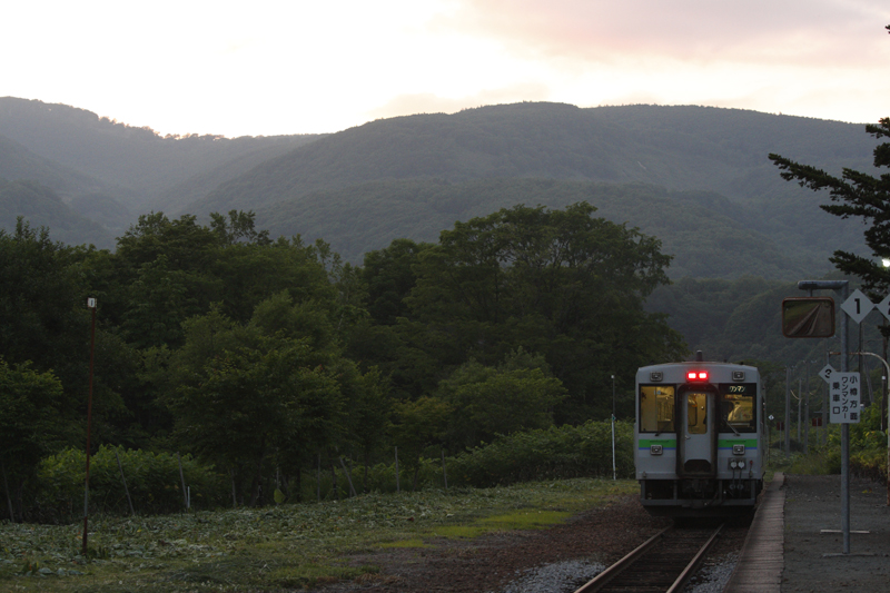 静かな夕暮れ時に一両の列車が止まっている。乗客もほとんど乗っていないようだった。