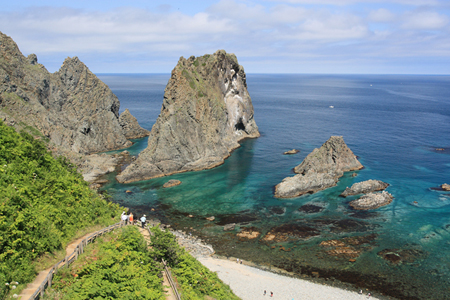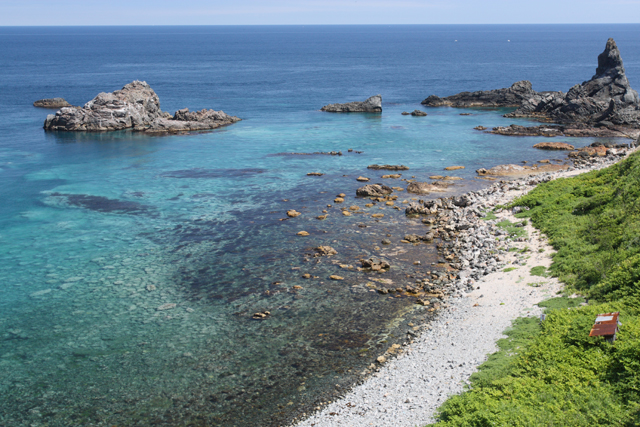 島武意海岸トンネルを抜けると、必ず誰しもが「すごーい」と声を上げる。もちろん僕もその例外ではなかった。島武意海岸は日本の渚百選にも選ばれたという、透明度の高い海岸だ。ここから階段で下まで降りることができる。