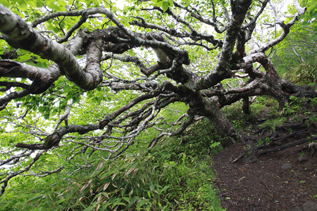 羊蹄山六合目を過ぎると、エゾマツなどの針葉樹林帯を抜けてダケカンバの森となる。登山道には風雨の影響なのだろうか、地面を這うように幹のまがったダケカンバの木があった。まるで羊蹄山の斜面から触手を伸ばして襲ってくるスーパーナチュラルな生命体のようだった。