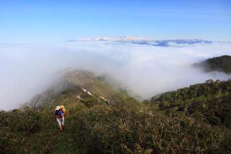 後ろを振り返ると雲海の中から登ってきた別の登山者の姿も見られました。