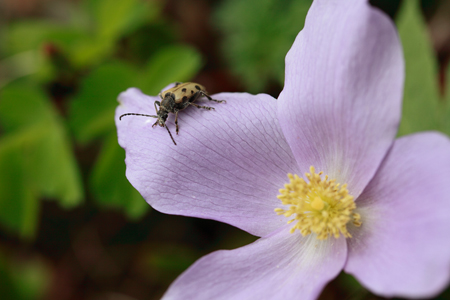 シラネアオイに止まったトホシハナカミキリ君。