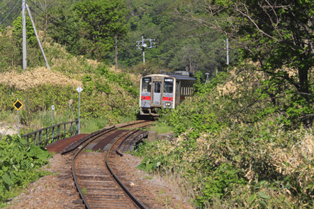 箸別駅を出発した列車が留萌方面に走り去ってゆく。