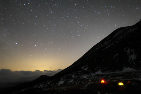 僕は三脚を立てると、ゆっくりとレリーズボタンを押した。時折流れ星が頭上を流れるのが見えた。小屋の隣にあるテントサイトでは十数張のテントが張られていたが、星空の下でぼんやりと灯った明かりがまるでキャンドルのようだった。 満天の星空が見えた夜の間、お化け三脚のカメラマンは小屋の中でずっといびきをかいていた。