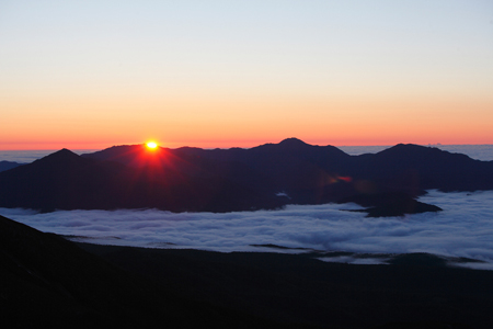 ご来光の瞬間、武利岳の方角から太陽が姿を現した!言葉はいらない。ただただ赤い、壮大な大雪山に昇る朝日だ。