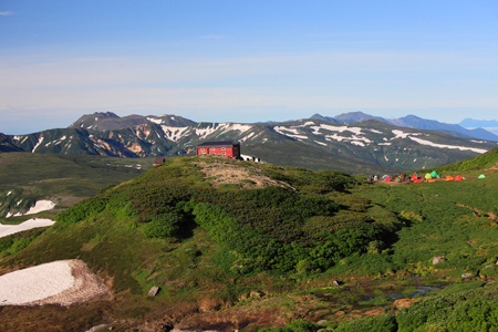 白雲分岐まで昇る途中で後ろを振り返ると、赤い壁の避難小屋の背後に、トムラウシとそれに連なる十勝岳連邦がくっきりと見えた。素晴らしい景色をありがとう。