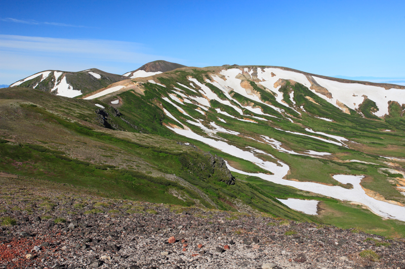 間宮岳に向かう途中で前方を見るとゼブラ模様のお鉢平、奥には大雪山の主峰旭岳が鎮座していた。