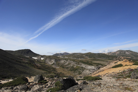 ほどなくして赤岳山頂に立った。そこからは表大雪の山をくっきりと見ることができた。紺碧の秋の空には一筋の雲がまるで大空へ舞い昇る銀の竜のごとく見えた。 白雲岳から立ち登る白い雲・・・。これ以上の絶好の組み合わせはないだろうなと思った。