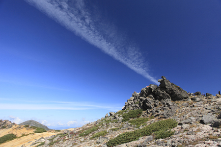 赤岳方面を振り返るとたくさんの人が休んでいるのが見えた。赤岳の地図上の三角点はもう少し北側にあるのだが、登山道的にはこの岩場が赤岳山頂だ。