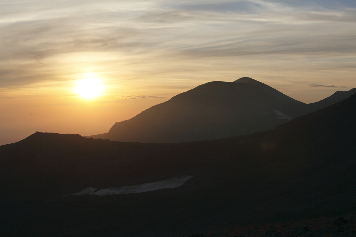 緑岳山頂についたときはすでに17時頃。ここから来た道を引き返してテント場に戻った。帰り道で旭岳に沈むきれいな夕日を見ることができた。