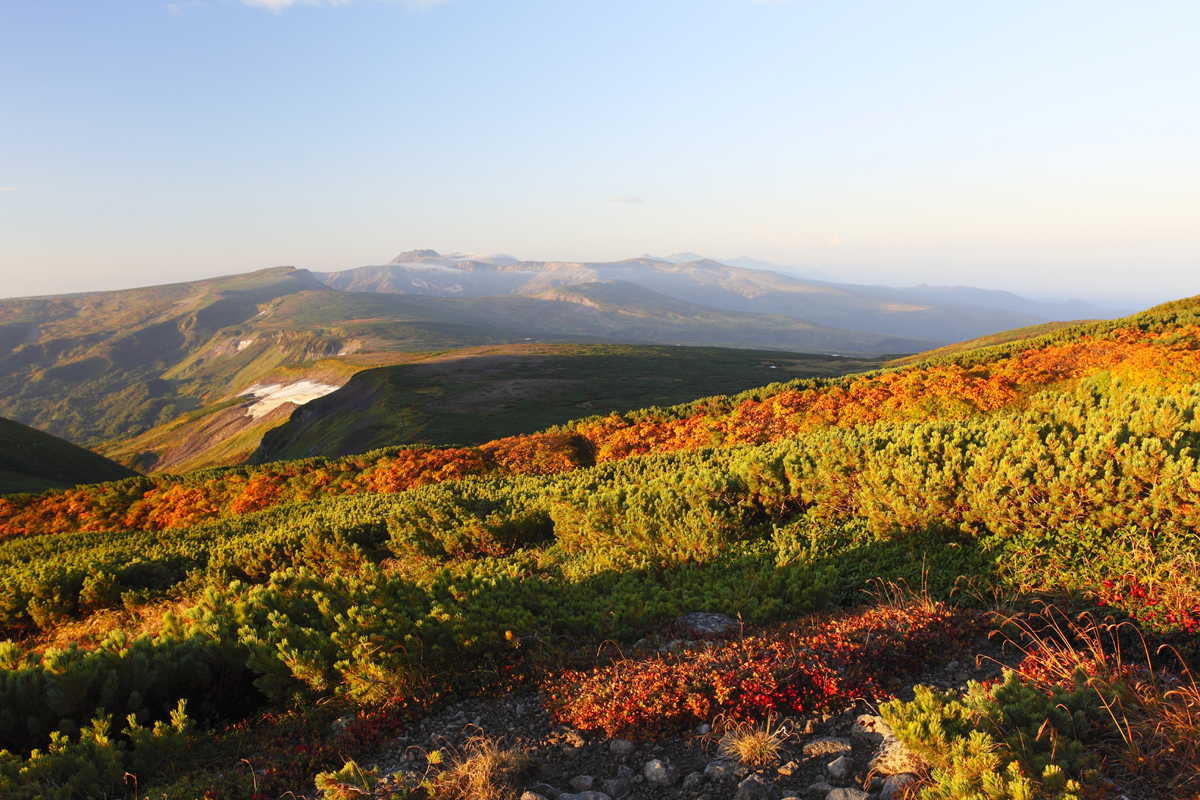 日が昇ってしばらくすると、紅葉がその鮮やかさをましてトムラウシと十勝岳の遠景を引き立てていた。