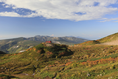 避難小屋の向こうに、秋晴れのトムラウシ山と十勝岳が望まれた。