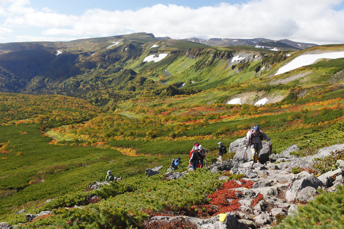 歩きやすかったなだらかな木道を過ぎると、山頂までの長いガレ場の登りとなる。後ろを振り返るたびに秋色に染まった高根ケ原と忠別岳の雄姿が、疲れた汗を吹き飛ばしてくれた。