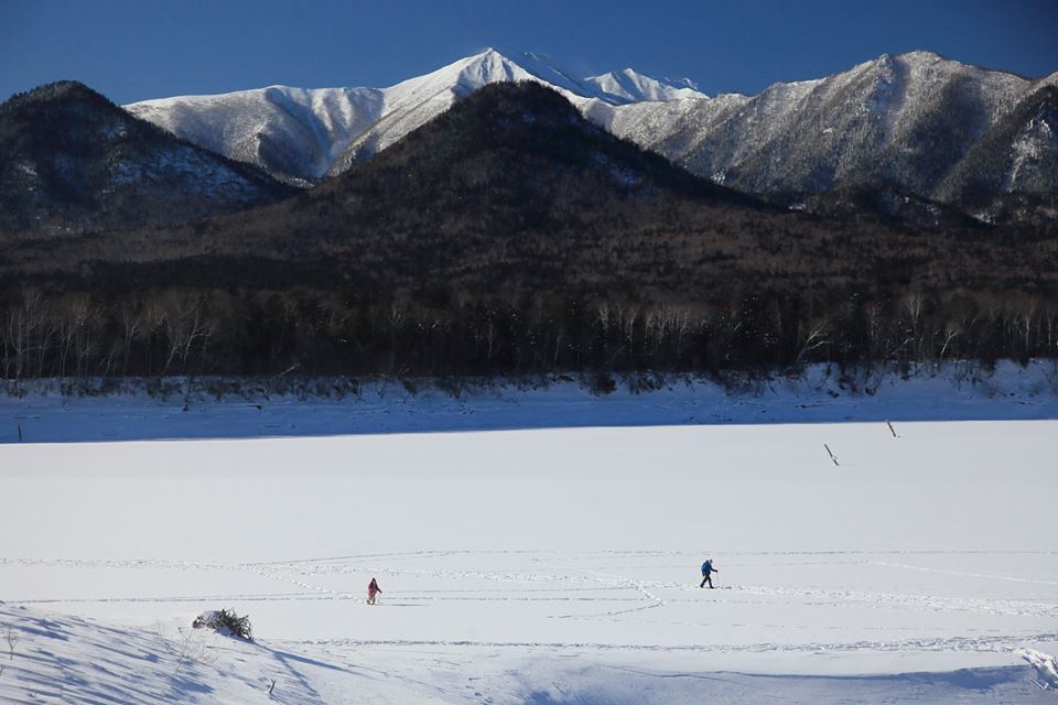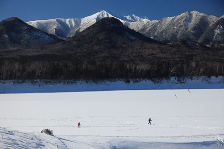 親子三人のスノーシュートレッキングを楽しんできた。 放射冷却で冷え込んだマイナス19℃の寒さの中、快晴の林を抜けて凍った湖面を歩く。