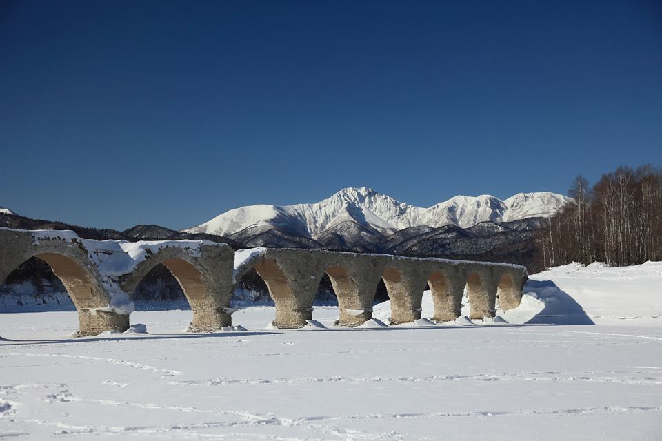 冬のタウシュベツ川橋梁。ニペソツ山がくっきりと見えた。